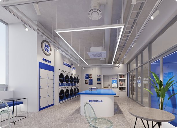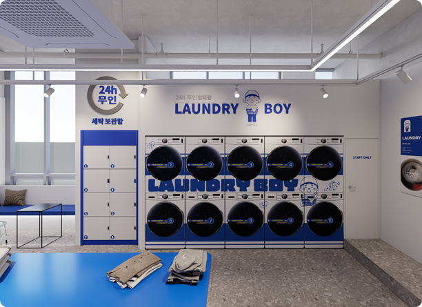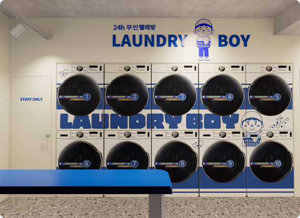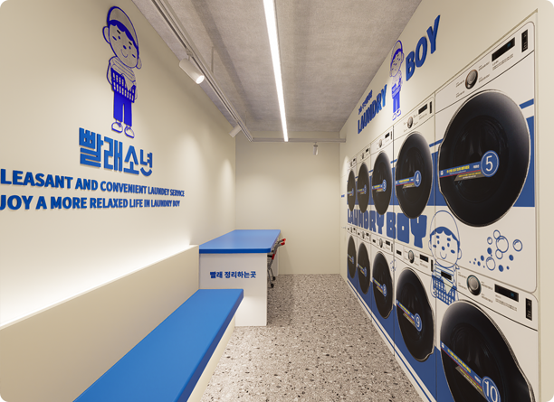 미국 WASKOR와 한국 SAMSUNG의 상업용 장비를 도입해 세탁력, 건조 속도, 내구성을 모두 잡았습니다.